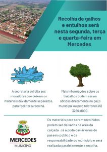 A administração do município de Mercedes informa aos proprietários dos imóveis urbanos particulares que desejam fazer a poda de árvores dentro do terreno, que as equipes vão passar fazendo a recolha e trituração dos galhos a partir de hoje, segunda-feira (31), até a próxima quarta-feira (02). Haverá ainda, a recolha de entulhos.