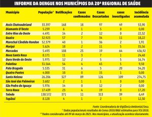 Em Santa Helena, a dengue também tem recebido olhares não simpáticos por parte da administração municipal. Prestes a decretar estado de epidemia, o município santa-helenense acumula 109 casos confirmados de dengue no ano epidemiológico 2020/2021. O índice de incidência acumulada, por sua vez, encontra-se em 343,43.