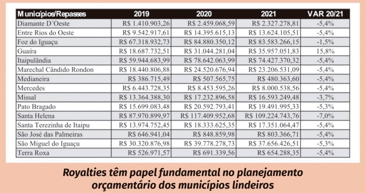 Guaíra apresenta elevação gradativa dos repasses desde 2018, quando recebeu de Itaipu cerca de R$ 19 milhões, e no ano seguinte o município arrecadou de royalties aproximadamente R$ 27 milhões.