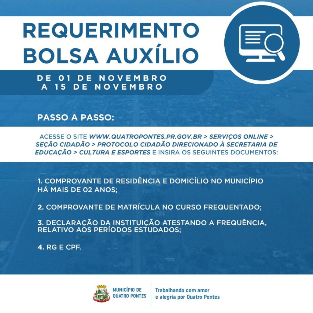 Até o dia 15, o requerimento da bolsa auxílio deve ser formalizado no site da Prefeitura de Quatro Pontes para pagamento referente ao segundo semestre (meses de julho a dezembro). Segundo a lei nº 2626/2022, de 27 de maio de 2022, a bolsa auxílio é destinada para estudantes que frequentam, no período de três a sete dias semanais, cursos de graduação, pós-graduação e técnico-profissionalizantes e residem e são domiciliados no município há mais de dois anos.