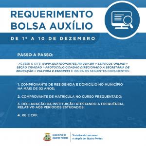 Os estudantes interessados precisam requerer a bolsa auxílio no site do município, no endereço www.quatropontes.pr.gov.br, devendo, assim, acessar serviços online, seção cidadão, protocolo cidadão, direcionado à Secretaria de Educação, Cultura e Esportes, e inserir os documentos: comprovante de residência e domicílio no município há mais de dois anos, comprovante de matrícula no curso frequentado, além da declaração da instituição atestando a frequência, relativo aos períodos estudados e RG e CPF. Quem preferir pode requerer na recepção da prefeitura.