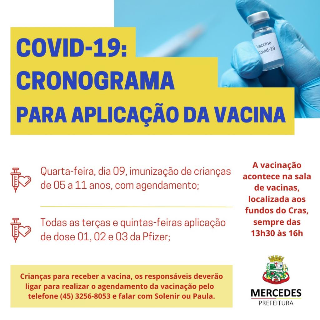 A Secretaria de Saúde de Mercedes dará sequência nesta semana ao cronograma de vacinação contra a Covid-19. Além da aplicação em adultos, crianças de 05 a 11 anos também terão acesso ao medicamento.