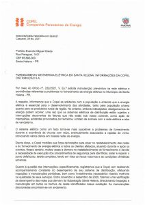 O município de Santa Helena encaminhou pedido ao diretor-presidente da Copel, Daniel Slaviero, no último dia 03, solicitando melhorias no fornecimento de energia, sobretudo na área rural de Santa Helena, cobrando da companhia ações como podas de árvores, inspeções e manutenções preventivas nas redes e limpeza em geral para evitar colapsos que se traduzem em enormes prejuízos para os usuários.
