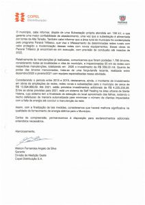 Em atenção à demanda, a Companhia Paranaense de Energia Elétrica retornou ofício afirmando que estão em andamento as obras do programa Paraná Trifásico que consiste na ampliação das redes de energia nas zonas rurais dos municípios. A conclusão desta frente de trabalho está prevista para 2022.