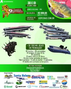 Integrando o calendário de eventos do município, o torneio vai distribuir R$ 300 mil em prêmios. Dentre eles, cinco lanchas, cinco carretinhas, quatro motores de popa 15 HP’s, um catamarã com capacidade para quatro pessoas, um motor elétrico 44 libras, vales-brindes e uma lancha na barqueata.