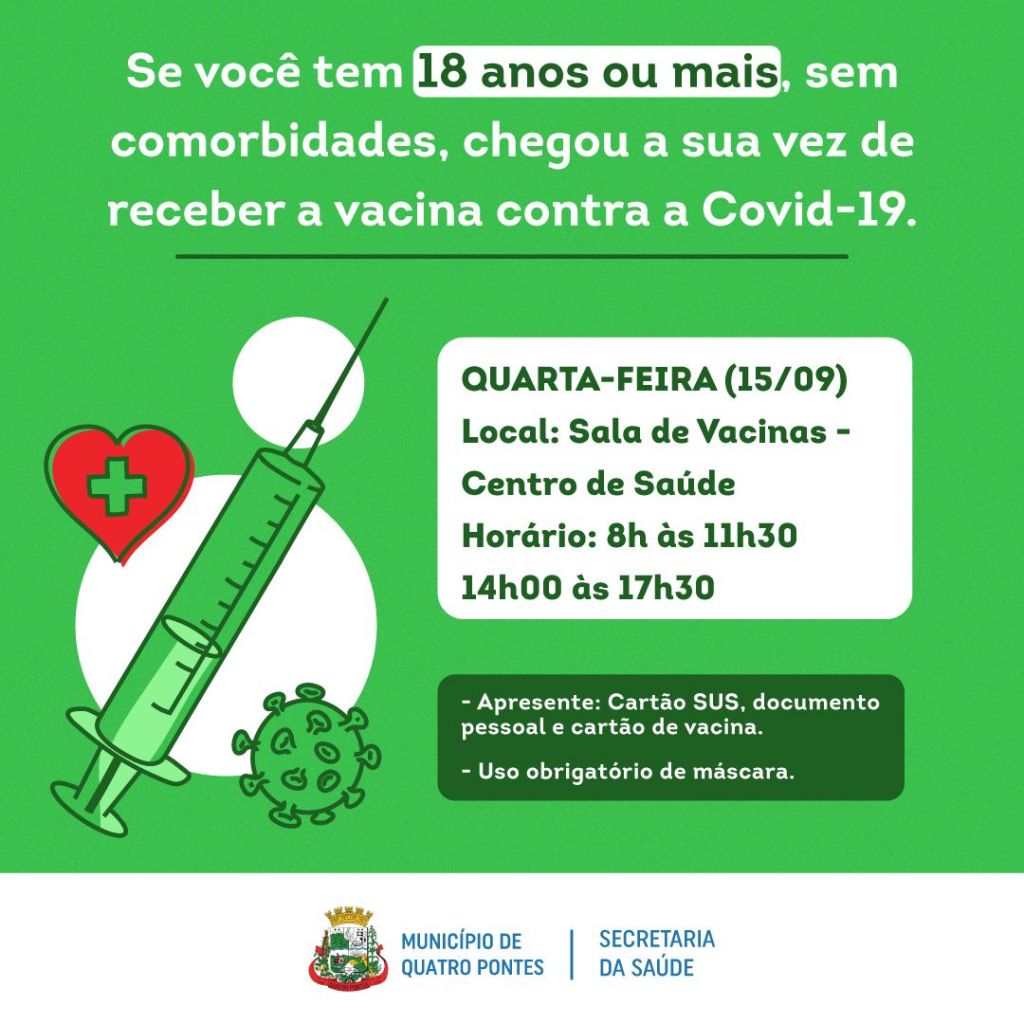 Nesta quarta-feira (15), a Secretaria de Saúde de Quatro Pontes iniciou a vacinação contra a Covid-19 em pessoas de 18 anos ou mais sem comorbidades. Os munícipes devem procurar a Sala de Vacinas, no Centro de Saúde, até as 11h30 e das 14 horas às 17h30.