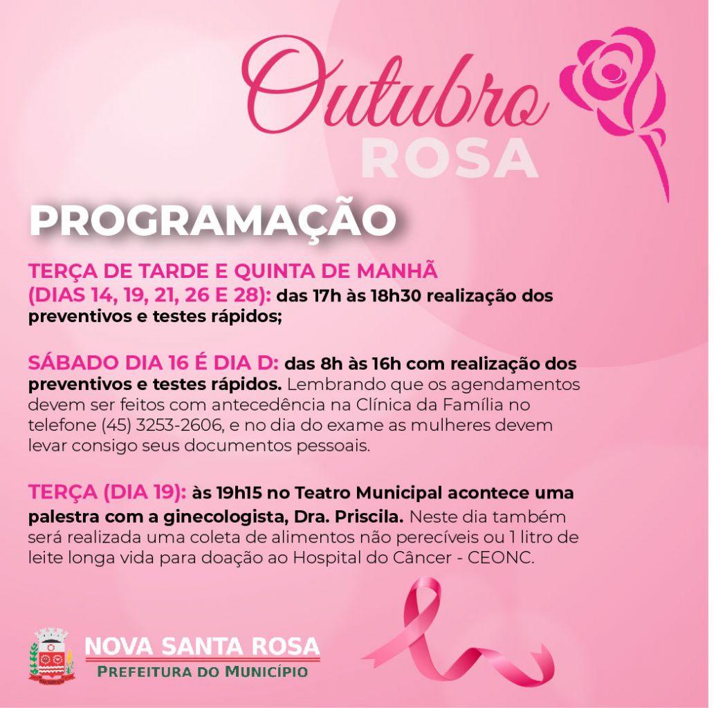 Nesta semana, a Prefeitura de Nova Santa Rosa, por meio da Secretaria de Saúde, lança a campanha Outubro Rosa. O objetivo é compartilhar informações e promover a conscientização sobre doenças relacionadas à saúde da mulher. Durante todo mês, será proporcionado as munícipes maior acesso, com agendamento especial, para exames de preventivo citopatológico, testes rápidos de HIV, sífilis, hepatite B, hepatite C e encaminhamentos para mamografia. A realização do preventivo é indicada para as mulheres de 18 a 64 anos e o de mamografia para mulheres de 50 a 69 anos.
