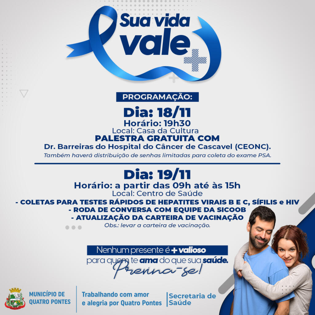 Intitulada ‘Sua vida vale +’, a campanha Novembro Azul de Quatro Pontes engloba ações especiais, organizadas pela Secretaria de Saúde para o público masculino. A iniciativa visa à conscientização na prevenção e combate ao câncer de próstata, importância do diagnóstico e da saúde do homem.