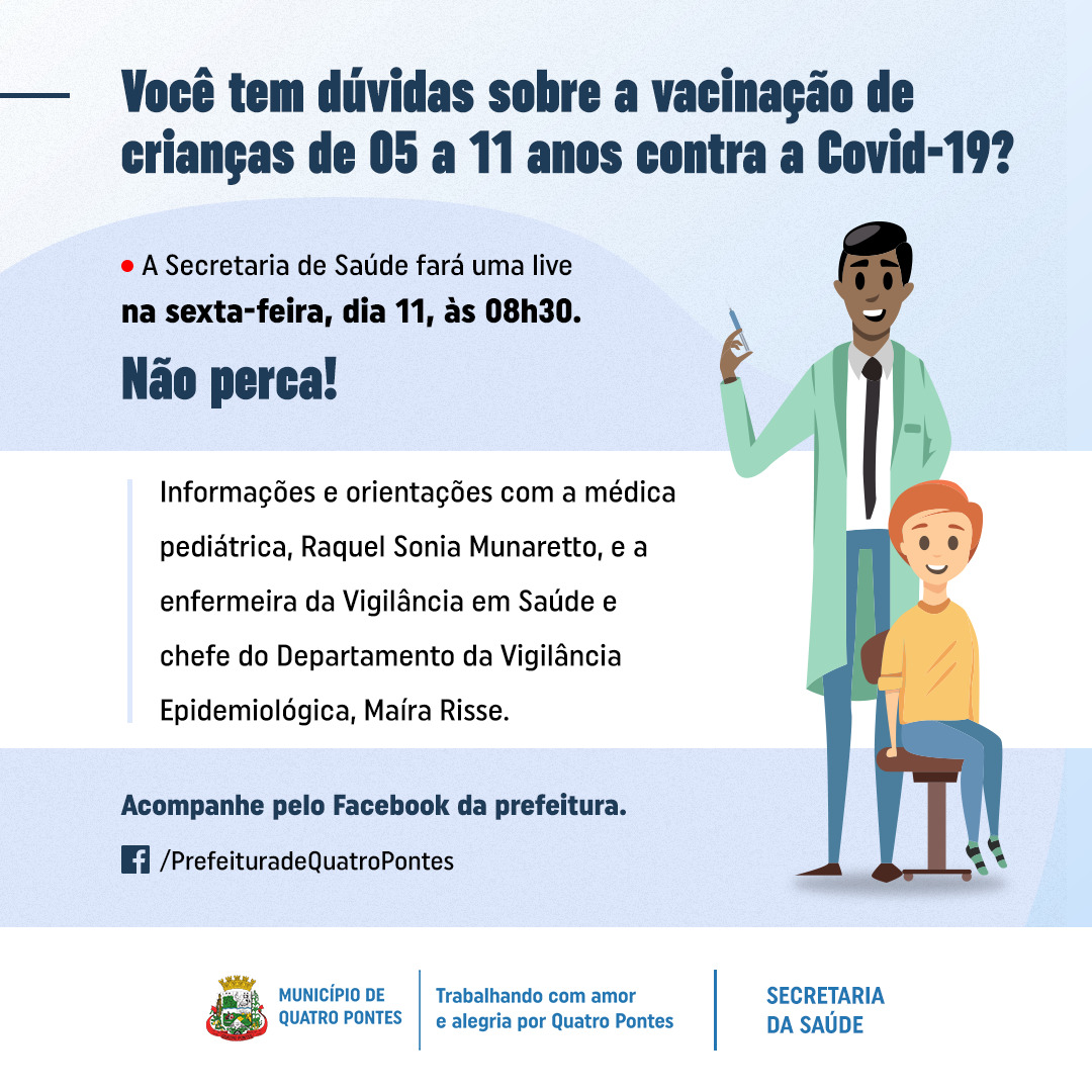 Com a proposta de sanar dúvidas, além de repassar informações e orientações referente à vacinação de crianças de 5 a 11 anos contra a Covid-19, a Secretaria de Saúde de Quatro Pontes promoverá uma live na sexta-feira (11), a partir das 08h30. Ela poderá ser acompanhada pela página da prefeitura no Facebook. A explanação será realizada pela médica pediátrica, Raquel Sonia Munaretto, e a enfermeira da Vigilância em Saúde e chefe do Departamento da Vigilância Epidemiológica, Maíra Risse.