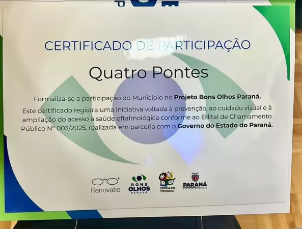 A Secretaria Municipal de Desenvolvimento Social de Quatro Pontes formalizou a adesão do município ao Programa Bons Olhos Paraná, iniciativa do Governo do Estado, coordenada pela Secretaria de Estado do Desenvolvimento Social e Família (SEDEF), voltada à promoção da saúde ocular de crianças e adolescentes da rede pública de ensino.