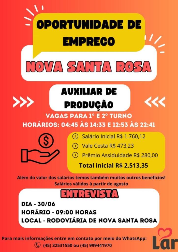 Acontece na manhã desta sexta-feira (30), na Agência do Trabalhador de Nova Santa Rosa, uma entrevista de emprego para interessados em trabalhar na LAR em Marechal Cândido Rondon. As vagas são para: Auxiliar de produção.