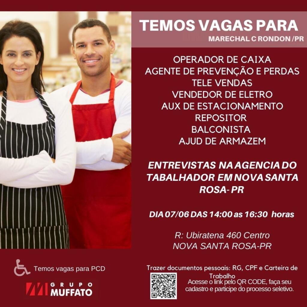 Acontece nesta quarta-feira (7), das 14 horas às 16h30, na Agência do Trabalhador de Nova Santa Rosa, uma entrevista de emprego para interessados em trabalhar no Grupo Muffato em Marechal Cândido Rondon.