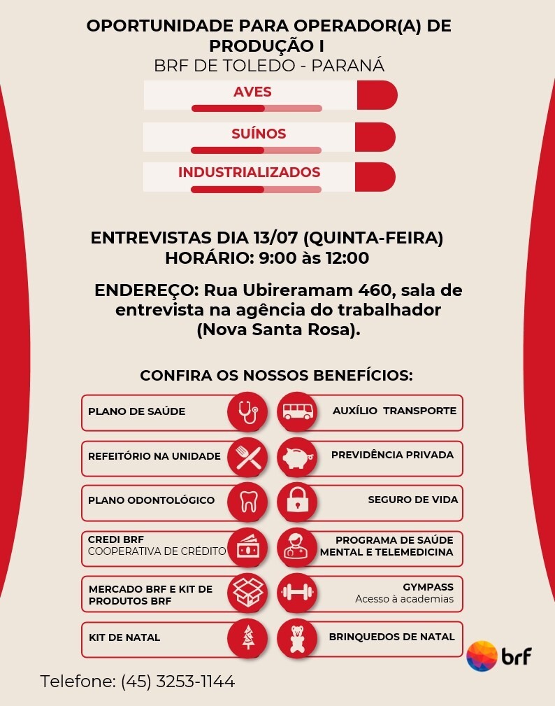 Acontece nesta quinta-feira (13), das 9 às 12 horas, na Agência do Trabalhador de Nova Santa Rosa, entrevista de emprego para interessados em trabalhar na BRF, em Toledo. As vagas são para operador de produção (aves, suínos, industrializados).