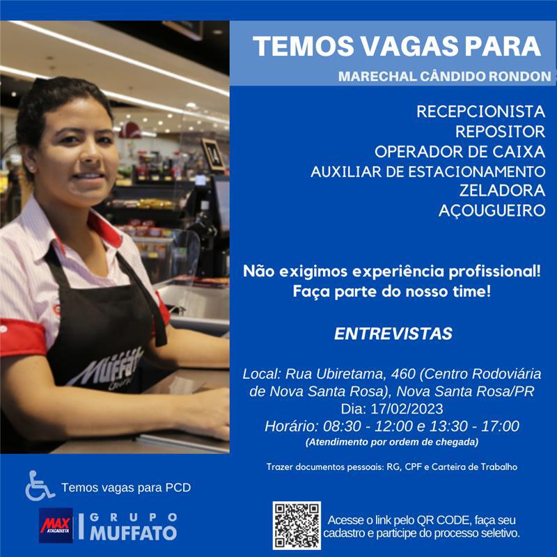 As vagas são para: recepcionista, repositor, operador de caixa, auxiliar de estacionamento, zeladora e açougueiro. Também existem vagas para PcD – Pessoa com Deficiência. É necessário levar os documentos pessoais: RG, CPF e Carteira de Trabalho.
