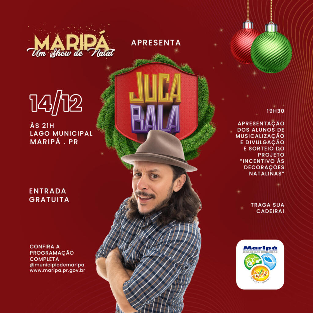 Um show de humor para dar boas risadas junto com a família e os amigos. É o que promete a apresentação do humorista Juca Bala nesta quarta-feira (14) durante a programação de “Maripá, Um Show de Natal”, promovido pelo governo municipal. O evento ocorre no Lago Municipal e tem entrada gratuita.