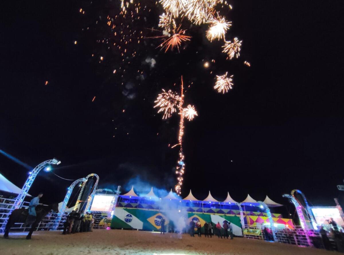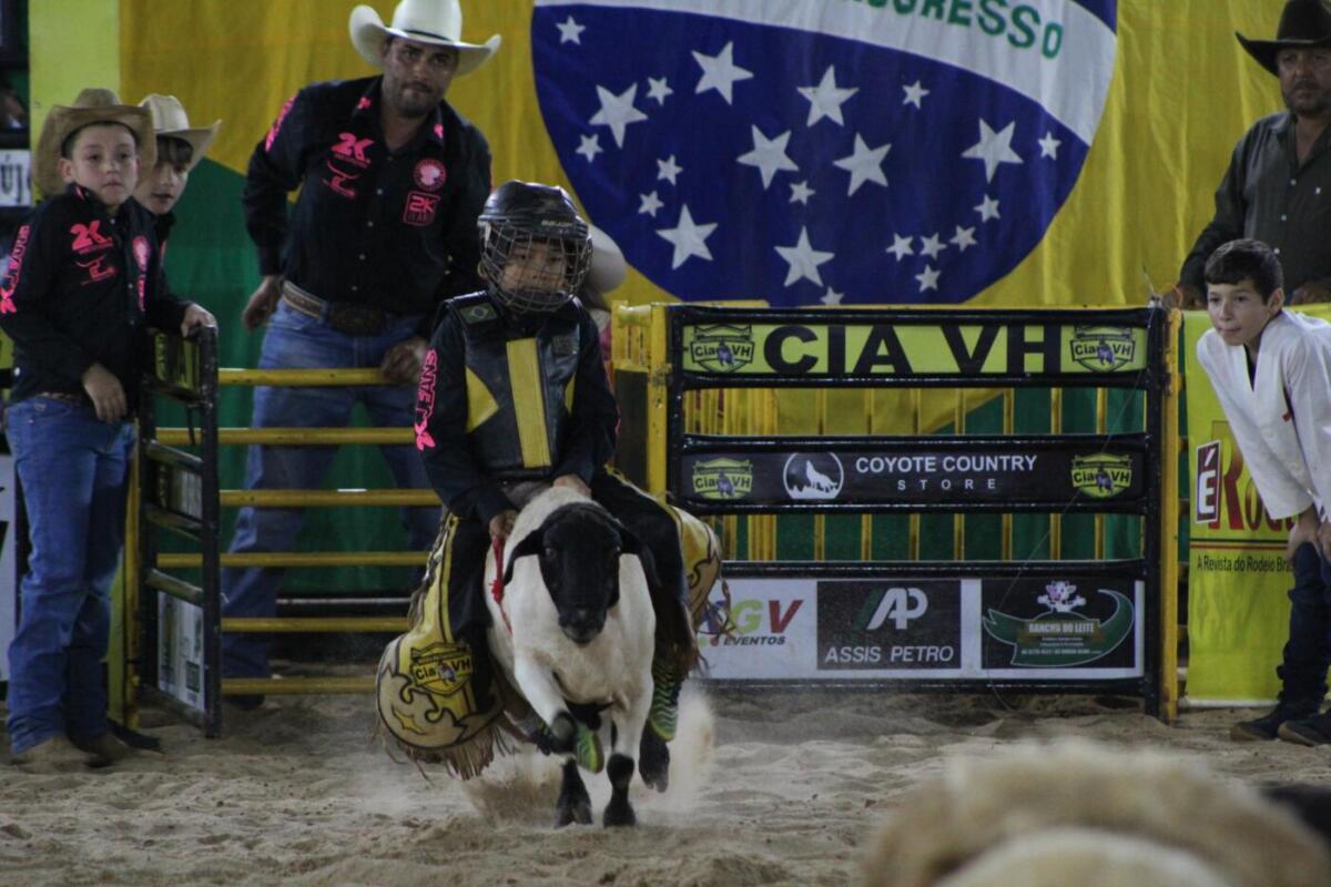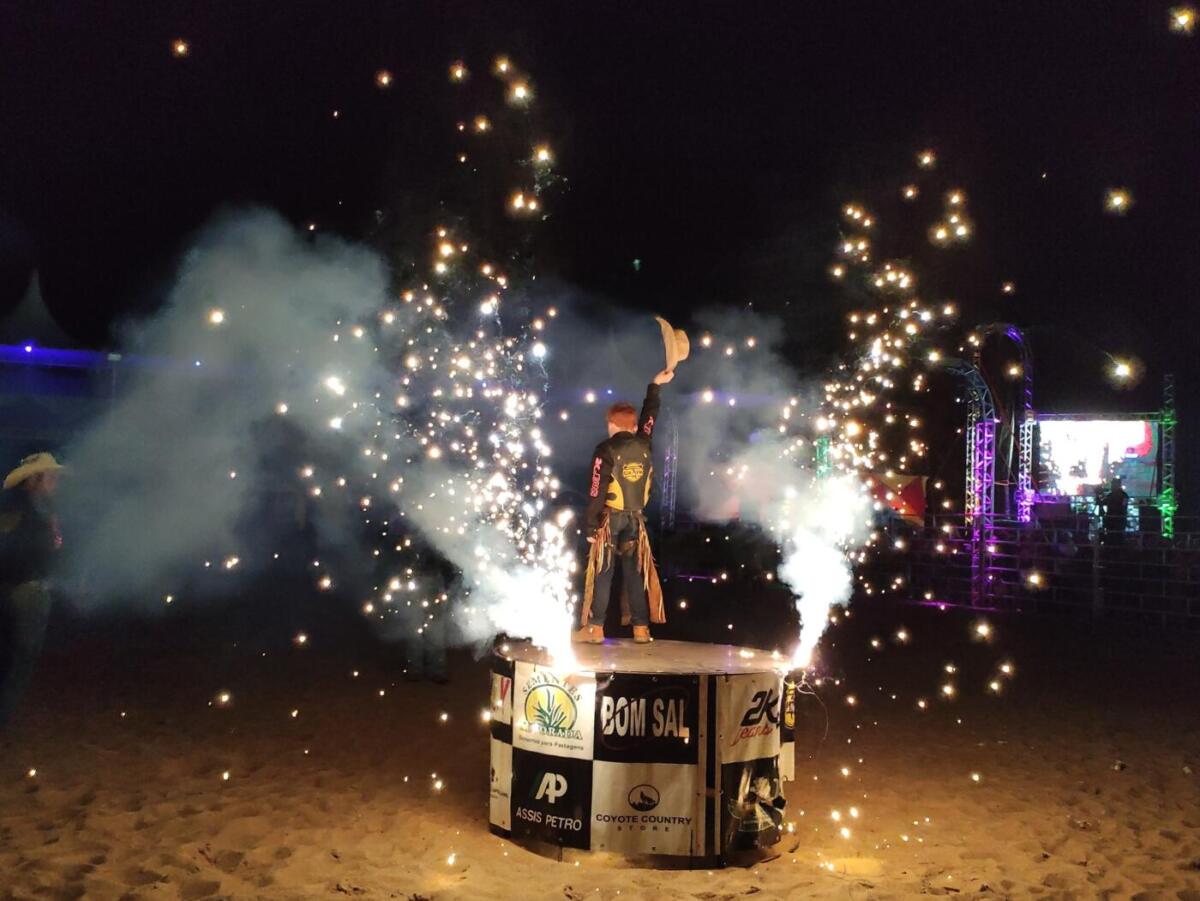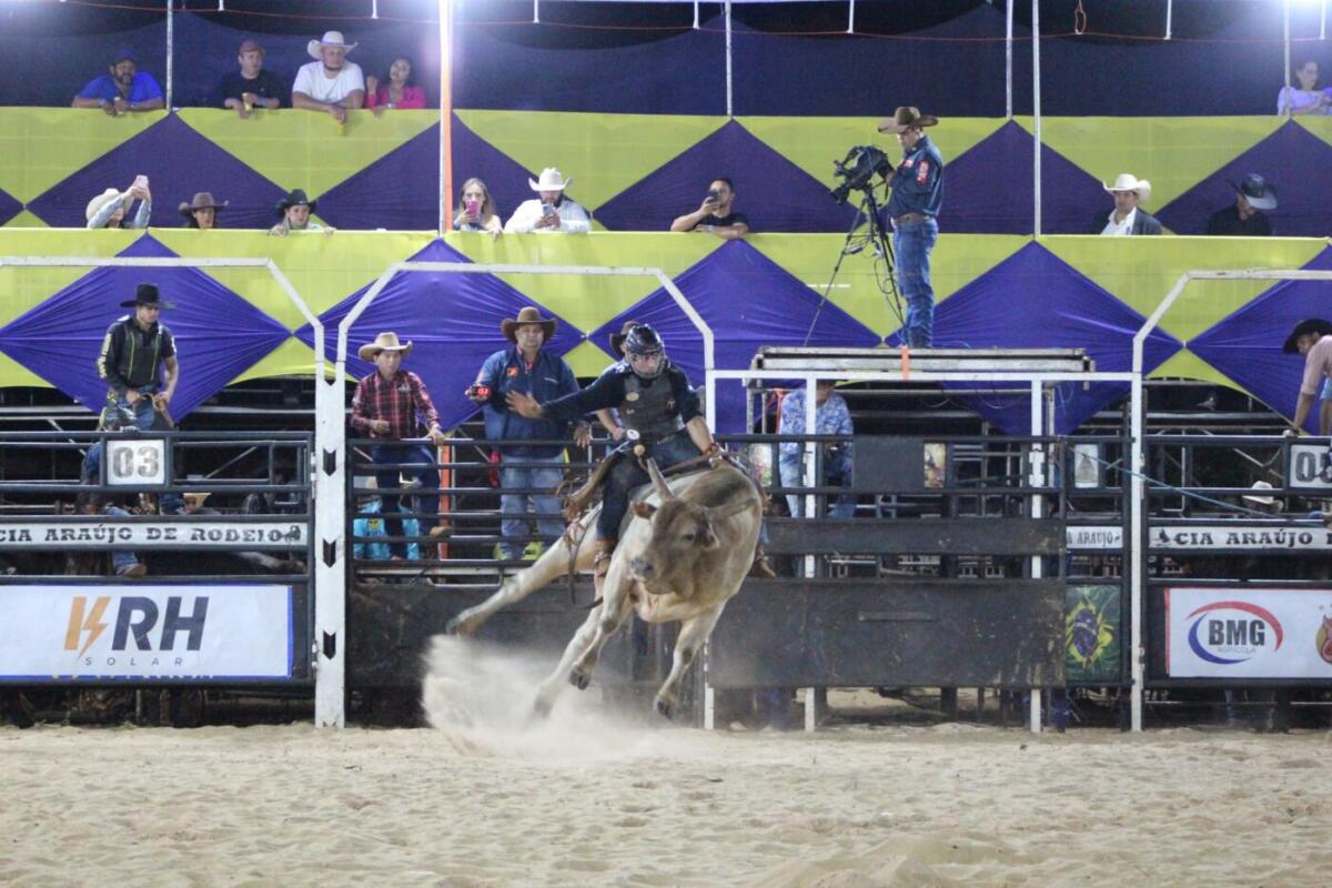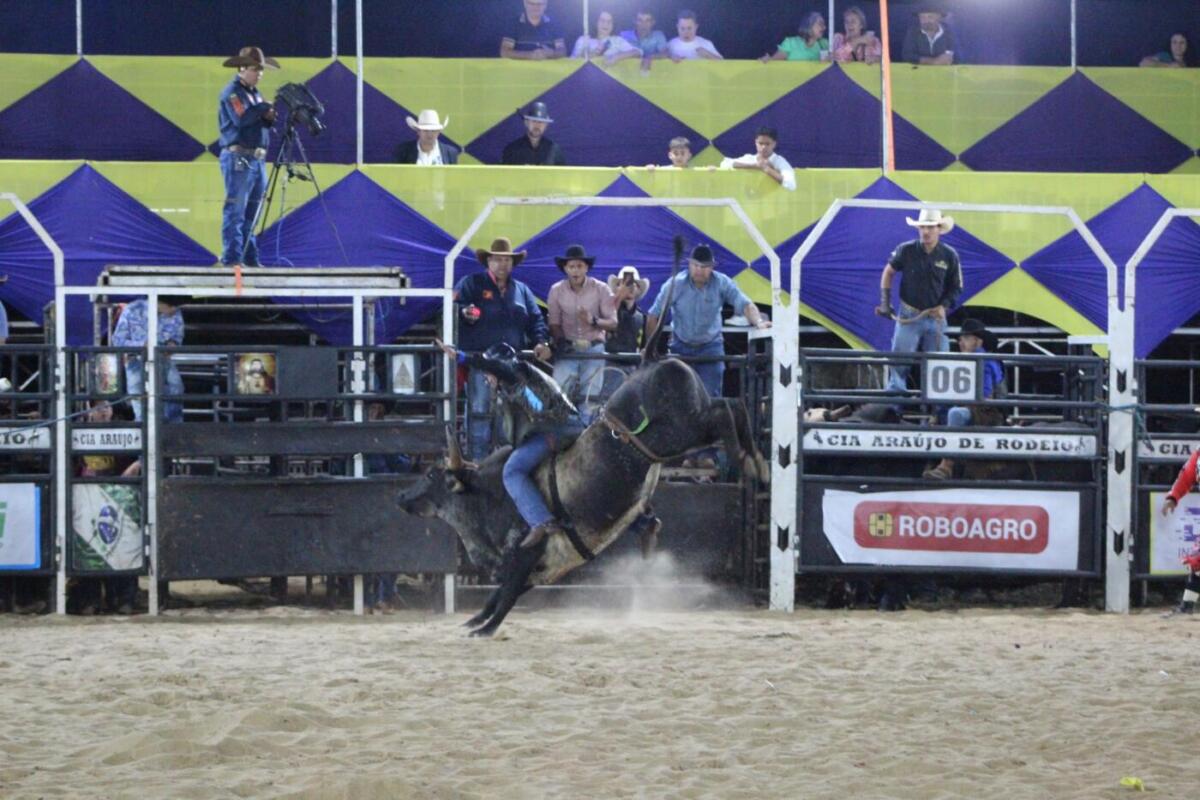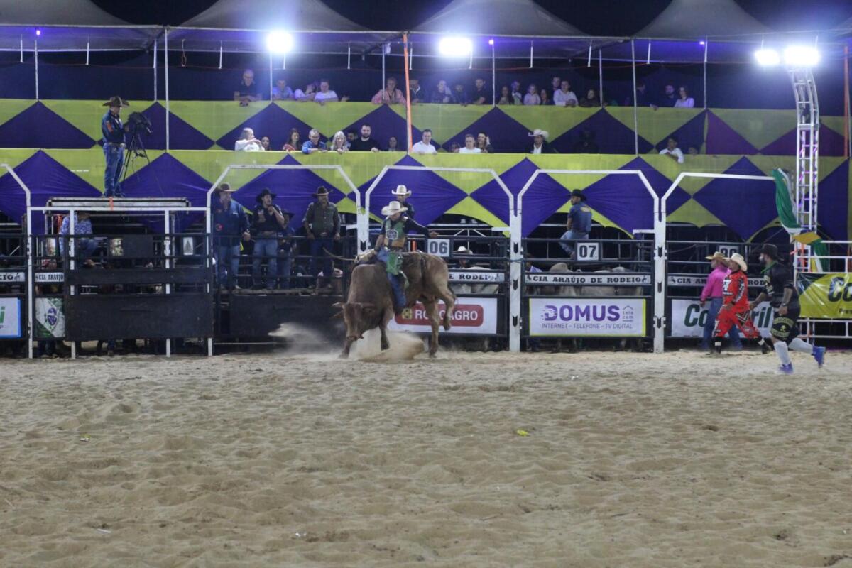 A noite teve a sequência do rodeio e a adrenalina tomou conta dos expectadores que prestigiaram montarias espetaculares em touros e cavalos.