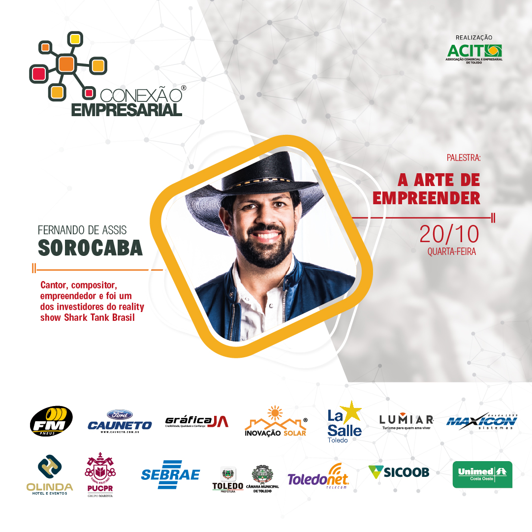 O cantor, compositor, empreendedor e investidor do reality show Shark Tank Brasil, se apresenta com a palestra “A arte de Empreender” no Teatro Municipal de Toledo a partir das 20 horas
