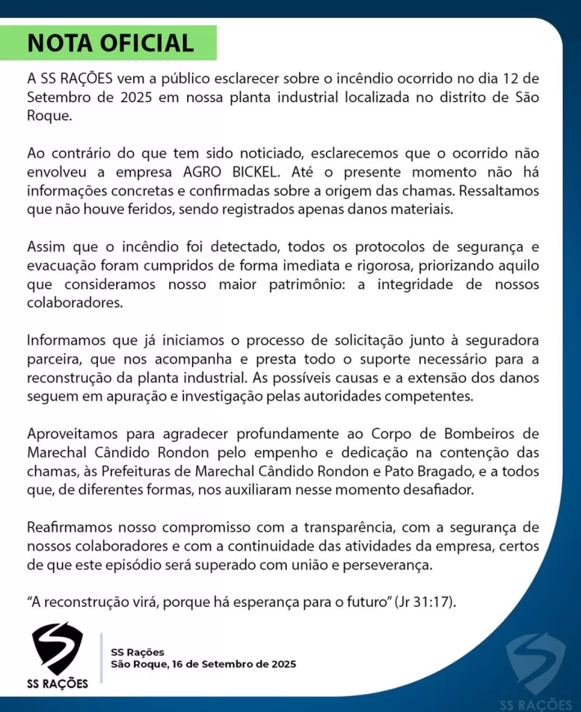 A empresa SS Rações divulgou nesta terça-feira (16) uma nota oficial a respeito do incêndio registrado na última sexta-feira (12) em sua planta industrial, localizada no distrito de São Roque, em Marechal Cândido Rondon.