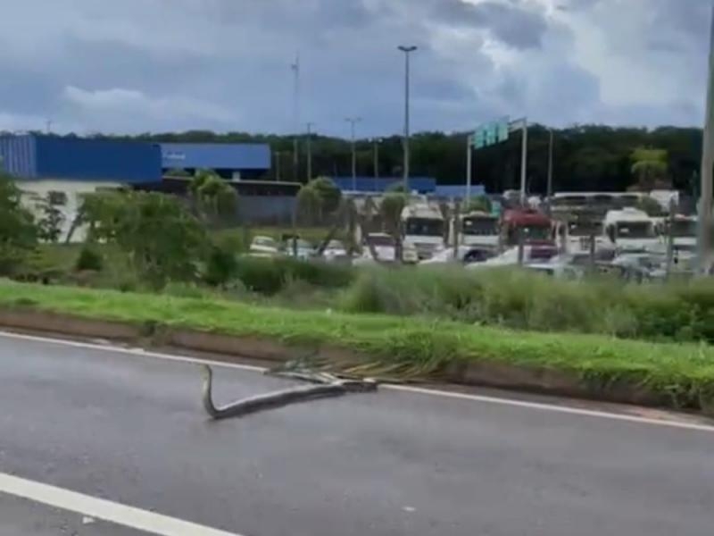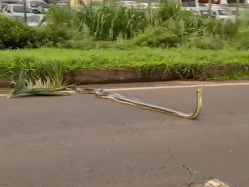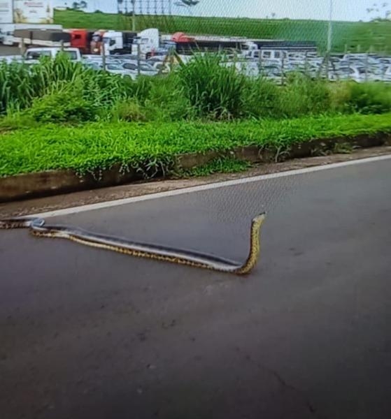 Uma sucuri foi avistada tentando atravessar a rodovia, no trevo de acesso à Receita Federal e ao Paraguai.