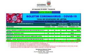 Informe divulgado pouco antes das 10 horas desta quinta-feira (25), pela 20ª Regional de Saúde de Toledo, revela que todos os 58 leitos de Unidade de Terapia Intensiva (UTI) reservados ao tratamento de pacientes com Covid-19 permanecem ocupados. Os dados são da Secretaria de Estado da Saúde (Sesa) e estavam atualizados até as 09 horas.