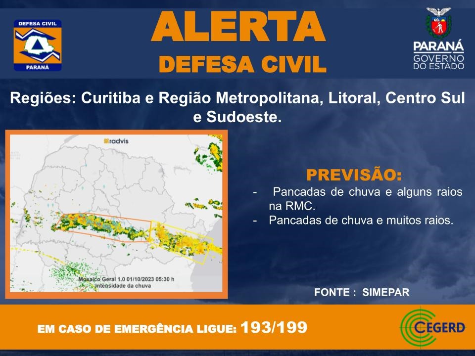 A Defesa Civil do Paraná emitiu, por volta das 07h20 deste domingo (1º), aviso de chuvas intensas, raios e vendaval para algumas regiões do Estado. A recomendação é que a população se proteja em local seguro. O alerta tem vigência de seis horas.