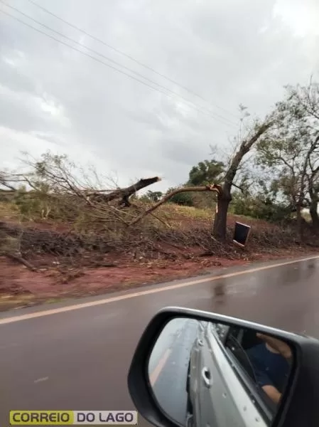 Árvores foram derrubadas e postes da rede elétrica acabaram caindo, interrompendo o fornecimento de energia para diversas propriedades da região.