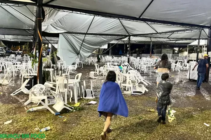 Minutos antes, o Instituto Nacional de Meteorologia (INMET) havia emitido um alerta para a região, indicando risco de chuva intensa e ventos fortes. Logo após o aviso, algumas tendas montadas para abrigar o público começaram a ceder, provocando correria e momentos de apreensão.