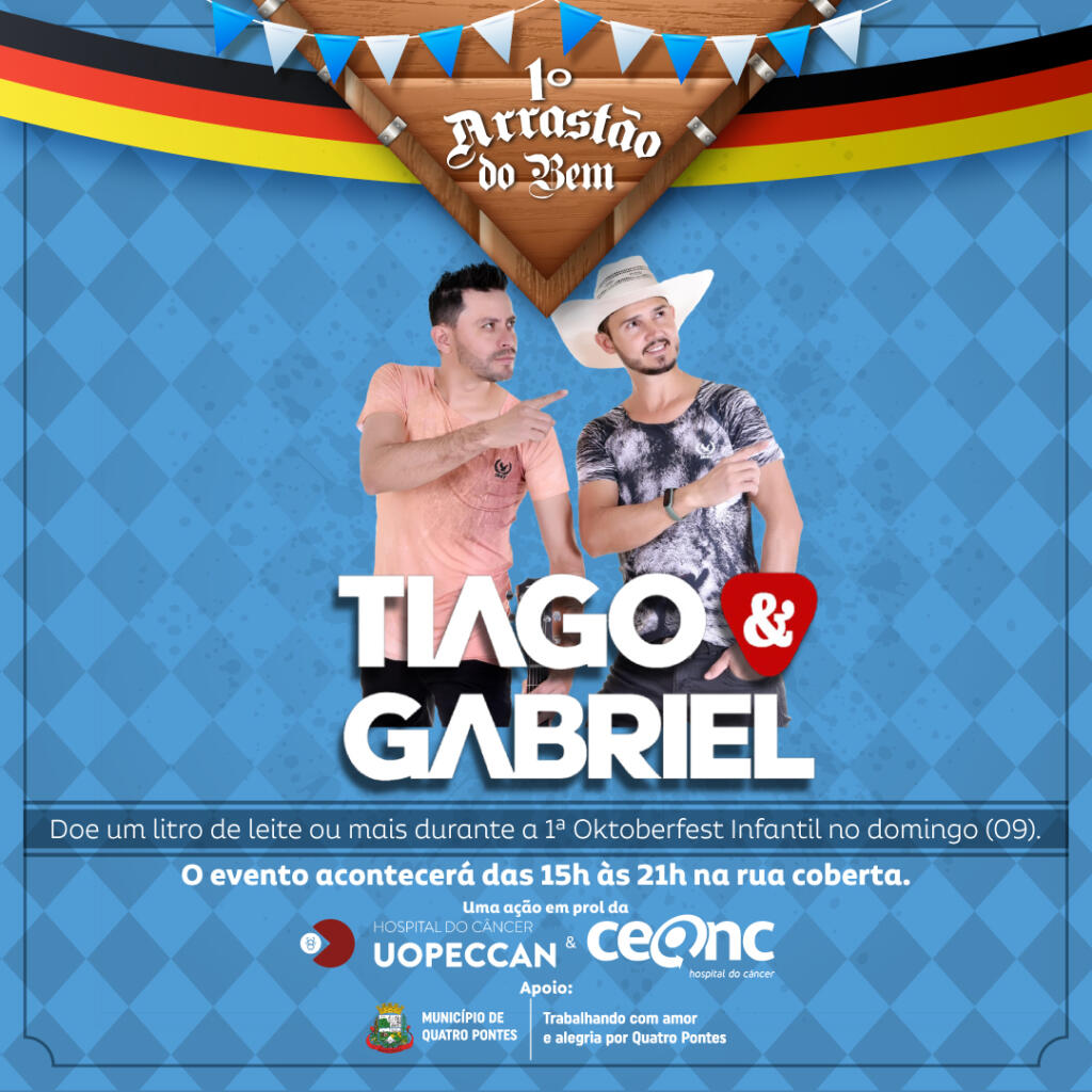 A dupla Tiago e Gabriel, com apoio da Prefeitura de Quatro Pontes, realiza no domingo (9) o 1º Arrastão do Bem em prol do Hospital do Câncer Uopeccan e do Centro de Oncologia de Cascavel (Ceonc). A ação, que ocorrerá durante a 1ª Oktoberfest Infantil, propõe a arrecadação de leite, podendo cada pessoa doar um litro ou mais.