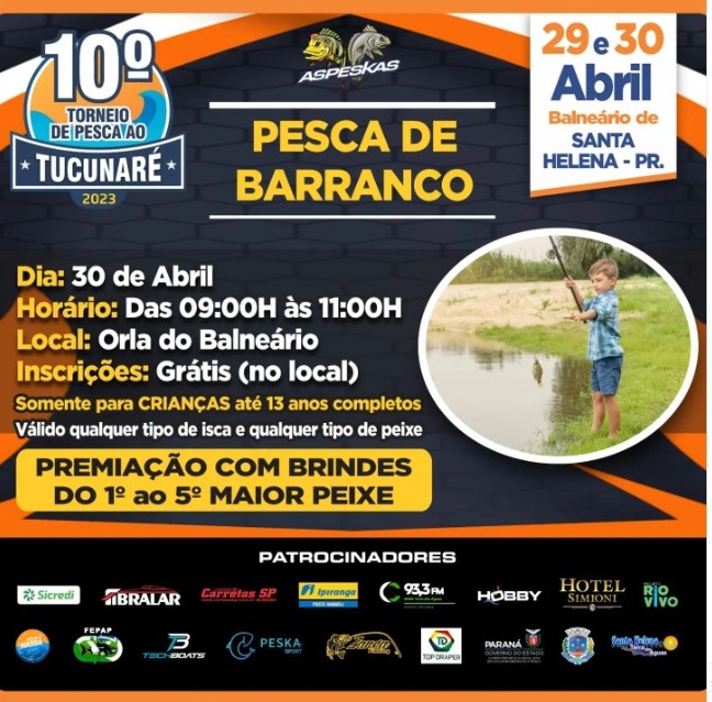O 10º Torneio de Pesca ao Tucunaré de Santa Helena é uma realização do município de Santa Helena em parceria com a Associação de Pesca Esportiva Kai&Sara (Aspeskas).