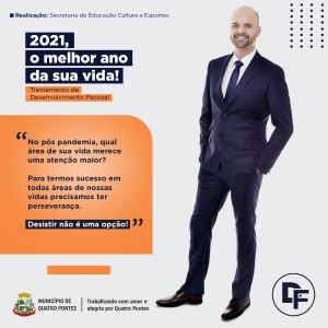 A Secretaria de Educação, Cultura e Esportes de Quatro Pontes encerrou as inscrições ao treinamento “2021: o melhor ano de sua vida”, visto que 100% das 60 vagas foram preenchidas. O treinamento, que é gratuito, ocorrerá nesta quarta-feira (27), a partir das 19h30, na Casa da Cultura. Para a ocasião, solicita-se que os participantes façam o uso de máscara e respeitem o distanciamento.