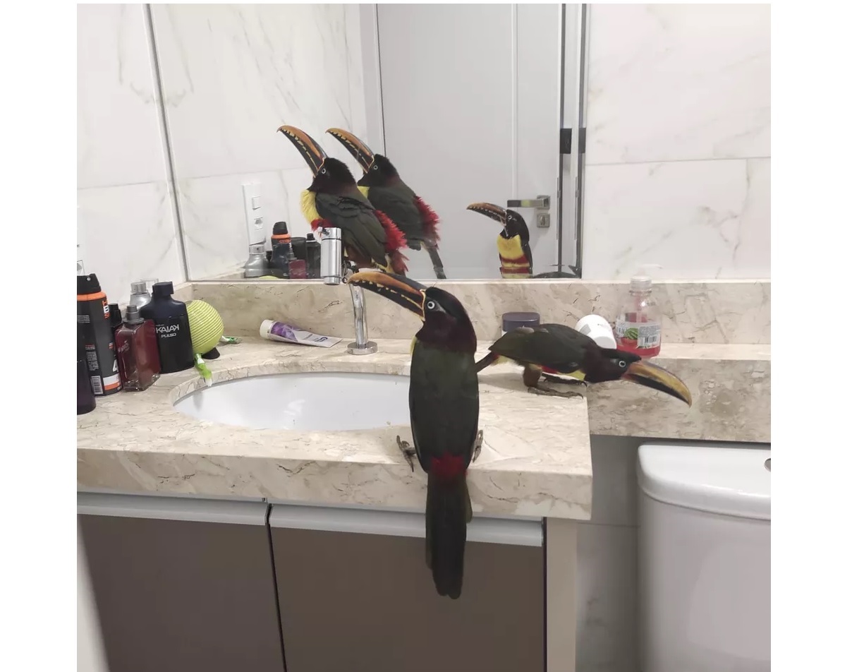 “Não é comum eles entrarem em casa. Talvez eles tenham visto o reflexo deles próprios no espelho e achando que tinha outros indivíduos da mesma espécie querendo disputar território com eles. São aves onívoras, se alimentam de frutos, ovos, filhotes de outras aves, insetos,”, comenta o observador.