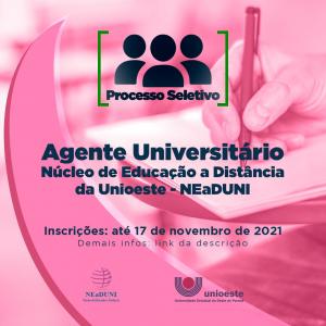 As inscrições para o processo seletivo de agentes universitários para o Núcleo de Educação a Distância – NEaDUNI – da Universidade Estadual do Oeste do Paraná (Unioeste) estão abertas até o dia 17 de novembro. O processo busca preencher vagas administrativas e o cadastro de reserva.