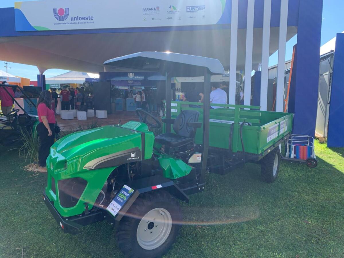 Durante os cinco dias do Show Rural a Universidade Estadual do Oeste do Paraná (Unioeste) apresentará projetos de seus cinco Campi. Dentre eles se destaca o projeto de transformação de um transportador agrícola, tipo “trator”, originalmente construído com motor a combustão, em um equipamento com motorização elétrica, em parceria com a empresa Moldemaq de Jaraguá do Sul (SC). O trabalho fez parte do projeto de Pós-doutorado do acadêmico Felix Augusto Pazuch, aluno do programa Pós-graduação em Engenharia de Energia na Agricultura (PPGEA) que possui nível de Mestrado e Doutorado.