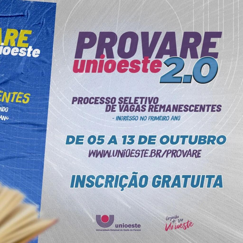 Estão abertas as incrições para a 2ª edição do Provare, processo seletivo para as vagas remanescentes da Univesidade Estadual do Oeste do Paraná (Unioeste).