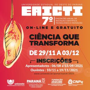 A Universidade Estadual do Oeste do Paraná (Unioeste) realizará o 7º Encontro Anual de Iniciação Científica, Tecnológica e Inovação (7º EAICTI) será de forma remota (virtual), no período de 29 de novembro a 03 de dezembro de 2021, que será totalmente on-line, por conta da epidemia de coronavírus.