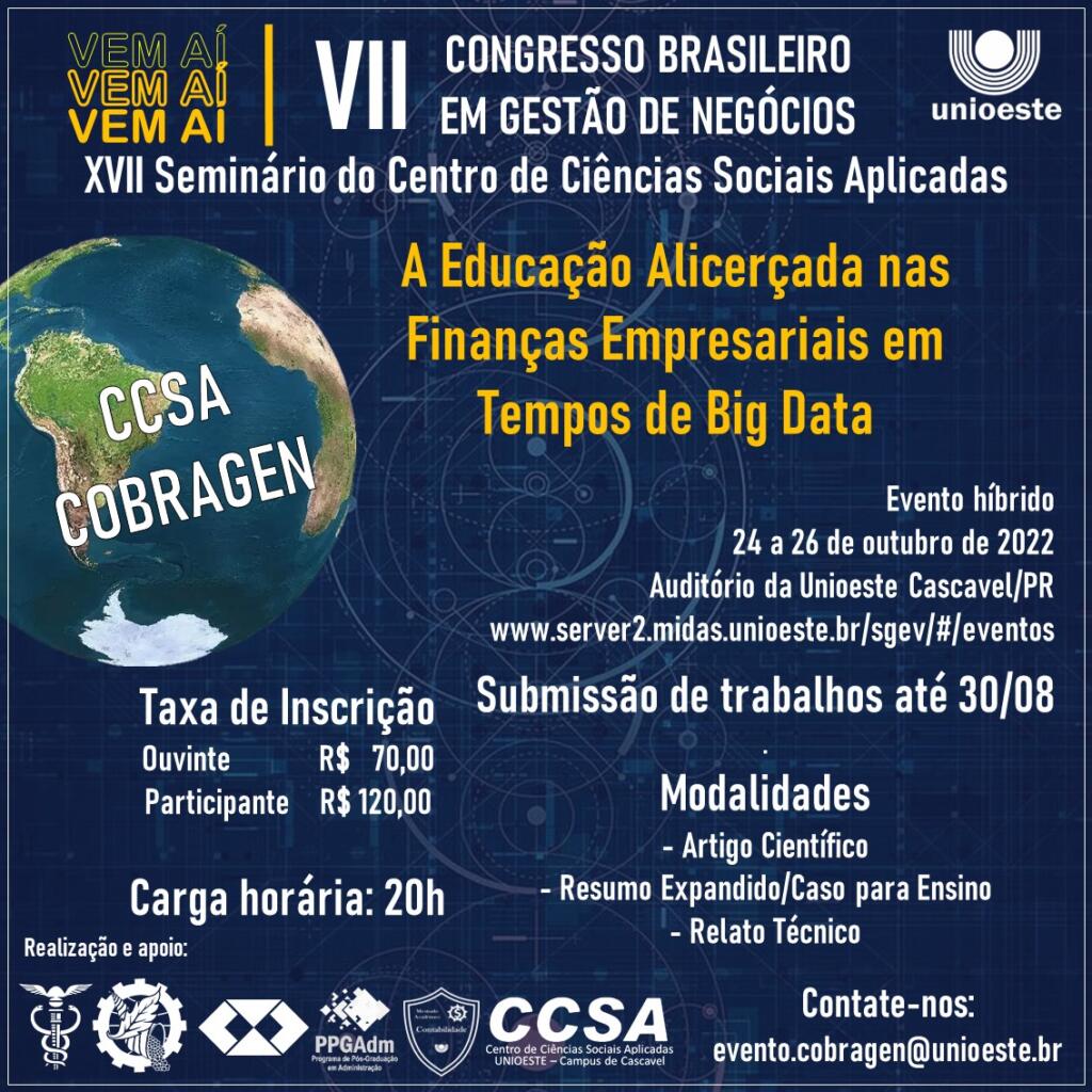 A Universidade Estadual do Oeste do Paraná (Unioeste) estará promovendo em outubro a VII edição do Congresso Brasileiro de Negócios – Cobragen. Este evento que tem como proposta a discussão de temas relacionados às Ciências Sociais Aplicadas, tais como Administração, Ciências Contábeis e Ciências Econômicas. Conjuntamente ocorrerá o XVII Seminário do Centro de Ciências Sociais Aplicadas (CCSA), do Campus de Cascavel, evento realizado desde 2002, que tem como finalidade apresentar assuntos relevantes da área a estudantes e profissionais das Ciências Sociais Aplicadas.