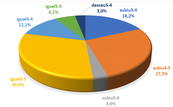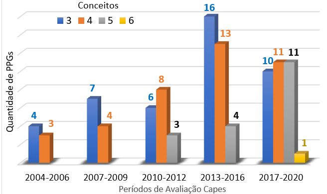 Dos 33 programas administrados pela instituição, 48,5% elevaram seus conceitos, dos quais 18,2% subiram de conceito 3 para 4; 27,3% de conceito 4 para 5 e 3,0% atingiu conceito 6. Outros 48,5% dos PPGs que mantiveram os conceitos da avaliação quadrienal 2013-2016, cerca de 30,3% são conceito 3; com conceito 4 são 12,1% e 6.1% com conceito 5 (Figura 2).