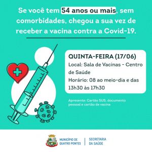 Amanhã (17), a Secretaria de Saúde de Quatro Pontes começará a vacinação contra a Covid-19 de mais um público: pessoas de 54 anos ou mais sem comorbidades. Para isso, os munícipes devem procurar a Sala de Vacinas, junto ao Centro de Saúde.