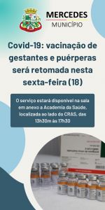 A Secretaria de Saúde de Mercedes informa que a vacinação em gestantes e puérperas, contra a Covid-19, acontece nesta sexta-feira (18). Será aplicada a vacina CoronaVac, produzida no Brasil pelo Instituto Butantan.
