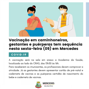 A Secretaria de Saúde de Mercedes informa que dará continuidade na imunização de caminhoneiros, gestantes e puérperas nesta sexta-feira (09). A vacinação será na sala em anexo a Academia da Saúde, localizada ao lado do CRAS, das 13h30 às 16 horas.