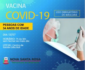 A Prefeitura de Nova Santa Rosa por meio da Secretaria de Saúde informa aos munícipes que nesta terça-feira (13) das 7 horas às 18 horas – sem fechar ao meio dia – acontece a vacinação do Covid-19 para as pessoas com 34 anos de idade.