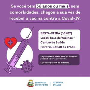 Com a chegada de mais doses da vacina contra a Covid-19 em Quatro Pontes, enviadas pela 20ª Regional de Saúde de Toledo, novo cronograma de vacinação foi organizado para hoje (30) pela Secretaria de Saúde. Das 13h30 às 17h30, as pessoas de 36 anos ou mais sem comorbidades devem procurar a Sala de Vacinas, no Centro de Saúde. Para receber a dose é necessário apresentar o Cartão SUS, um documento pessoal e a carteira de vacinas. O uso de máscara é obrigatório, podendo ser dispensado se estiver sem o equipamento de segurança.