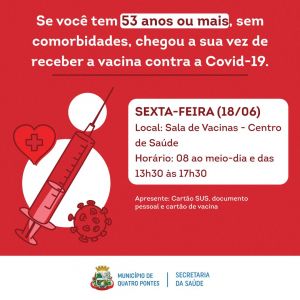 Hoje (18), a Secretaria de Saúde de Quatro Pontes começará a vacinação contra a Covid-19 em pessoas de 53 anos ou mais sem comorbidades. Para isso, os munícipes devem procurar a Sala de Vacinas, junto ao Centro de Saúde.