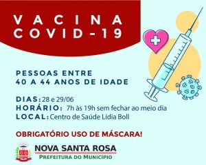 A Prefeitura de Nova Santa Rosa, por meio da Secretaria de Saúde, informa aos munícipes que na segunda-feira (28) e terça-feira (29) haverá mais uma etapa de vacinação. Munícipes sem comorbidades que tenham entre 40 e 44 anos de idade poderão se vacinar.