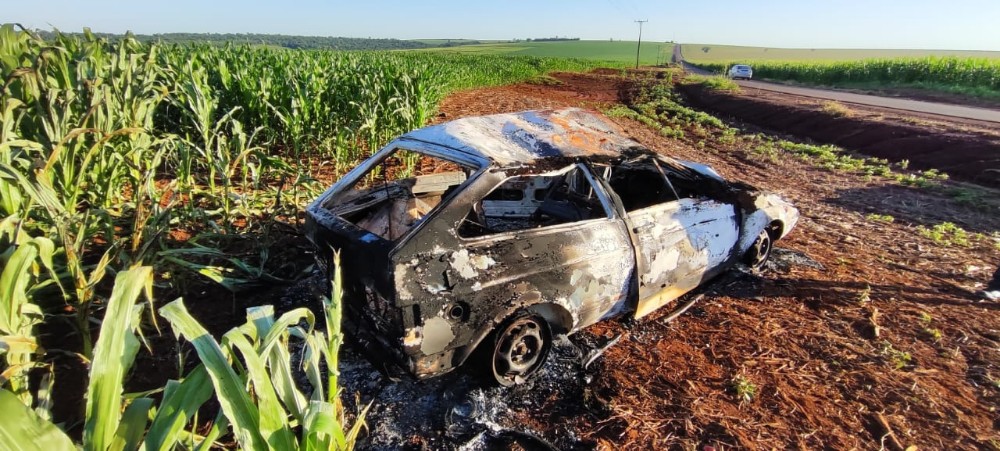 O veículo Gol, branco, quadrado, utilizado no assalto à agência do Sicoob em Nova Santa Rosa, na madrugada desta sexta-feira (21), foi encontrado capotado e incendiado na curva da onça, no distrito de Santa Rita do Oeste, no município de Terra Roxa.