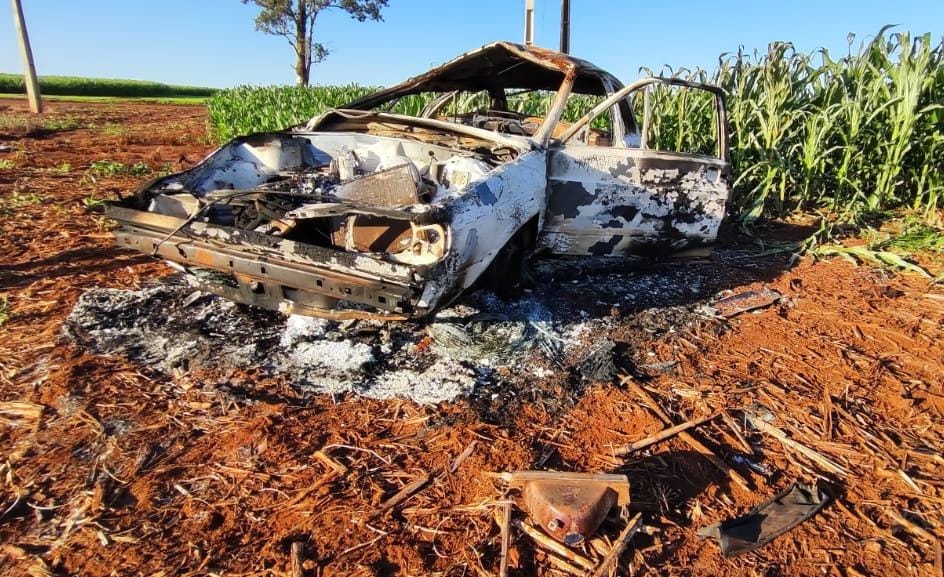 O veículo Gol, branco, quadrado, utilizado no assalto à agência do Sicoob em Nova Santa Rosa, na madrugada desta sexta-feira (21), foi encontrado capotado e incendiado na curva da onça, no distrito de Santa Rita do Oeste, no município de Terra Roxa.