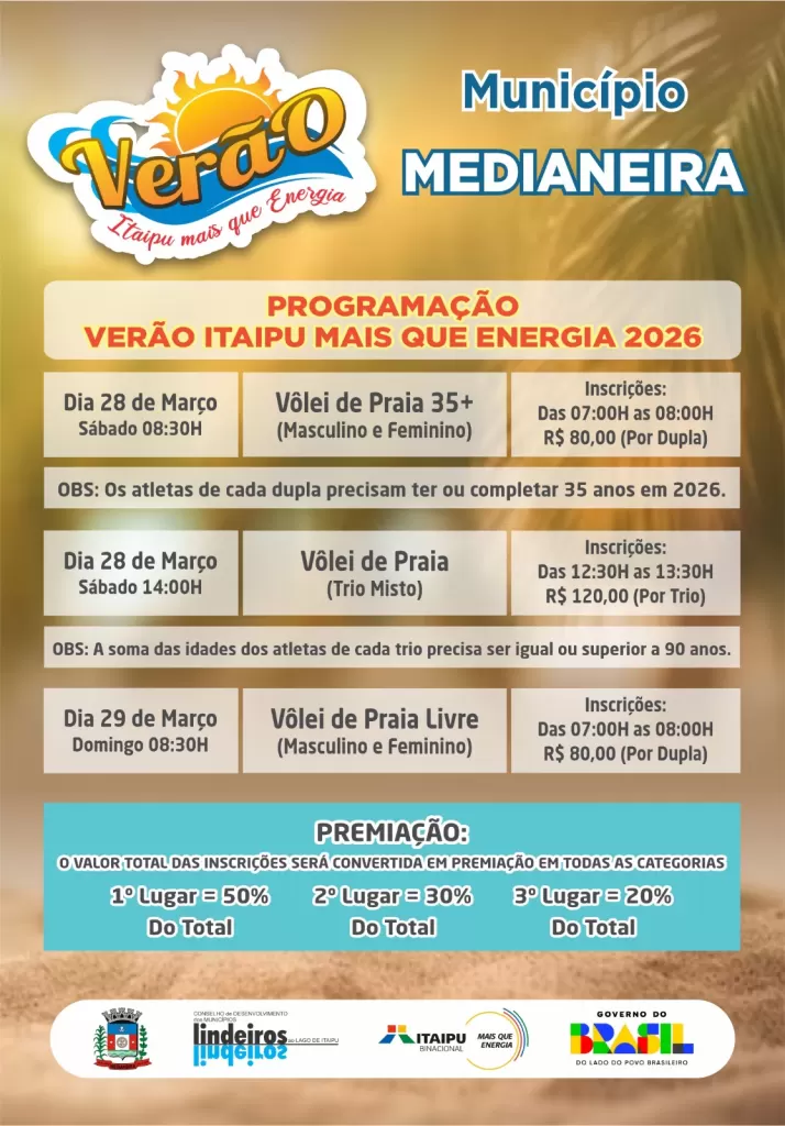 No município de Medianeira, o sábado (28) terá disputas de vôlei de praia 35+ (masculino e feminino), com inscrições das 7 horas às 8 horas, no valor de R$ 80 por dupla. Ainda no mesmo dia, será realizado o vôlei de praia em trios mistos, com exigência de soma mínima da idade dos atletas de 90 anos. As inscrições para esta modalidade ocorrem das 12h30 às 13h30, ao custo de R$ 120 por equipe. No domingo (29), será disputado o vôlei de praia livre (masculino e feminino), com inscrições das 7 horas às 8 horas, no valor de R$ 80 por dupla. Em todas as categorias, os valores arrecadados serão revertidos em premiação. Os jogos ocorrerão no complexo poliesportivo.