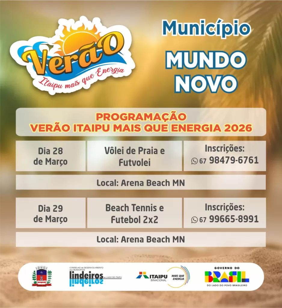 Já em Mundo Novo, nos dias 28 e 29 de março, será realizado o vôlei de praia masculino e feminino livre, futevôlei, beach tênis e futebol suíço 2×2. Os jogos ocorrerão na Arena Beach MN. As inscrições para o vôlei e futevôlei podem ser feitas pelo (67) 98479-6761 e para o beach tênis no (67) 99665-8991.