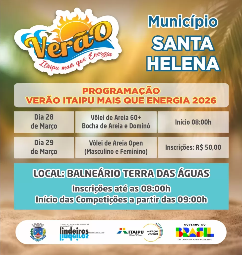 Os municípios de Santa Helena, Medianeira e Mundo Novo sediam, neste final de semana, dias 28 e 29 de março, a última etapa do Verão Itaipu Mais que Energia, edição 2026. Serão realizadas competições esportivas, além de atividades culturais, de lazer e entretenimento. O projeto já passou por 13 municípios.