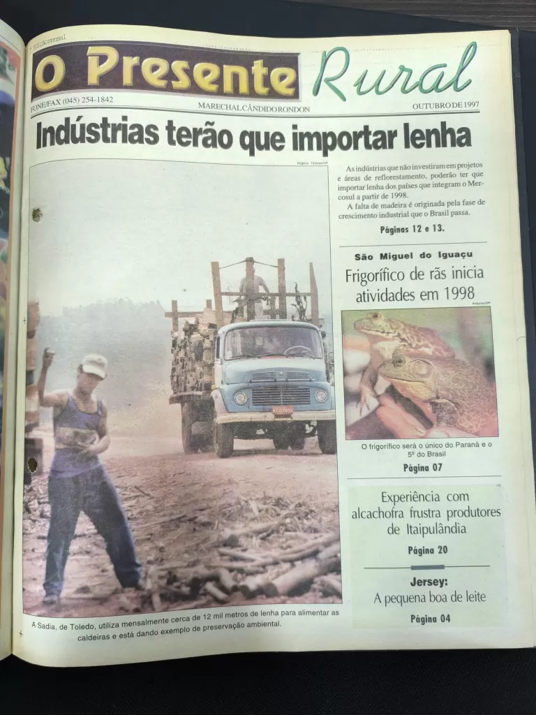 A capa anunciava um tema que refletia as preocupações da época: “Indústrias terão que importar lenha”. O texto alertava para a falta de madeira destinada às caldeiras industriais — uma questão que envolvia reflorestamento, sustentabilidade e competitividade, assuntos que seguem atuais quase três décadas depois. A matéria mostrava, inclusive, o exemplo da Sadia, de Toledo, que consumia cerca de 12 mil metros de lenha ao mês e buscava práticas de preservação ambiental.